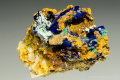 藍銅鉱の結晶上に薄緑色の微小結晶が付いています。濃緑色の孔雀石を伴います。