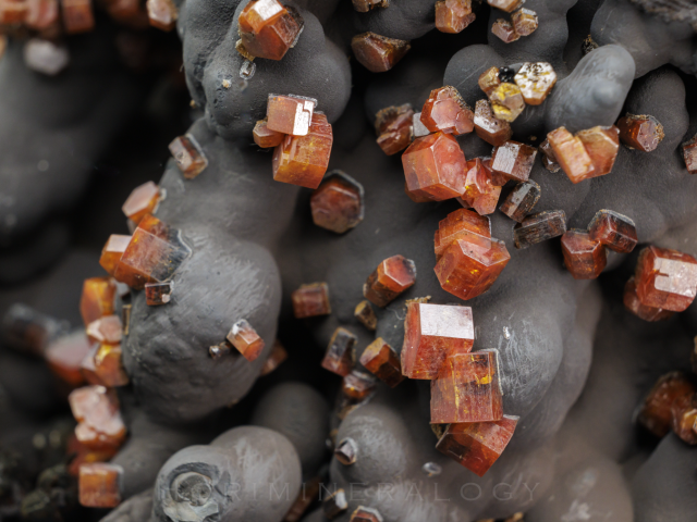 Formula: Pb5(VO4)3Cl Crystal System: Hexagonal Hardness: 2½-3 Density: 6.95 楽しい鉱物図鑑127p
