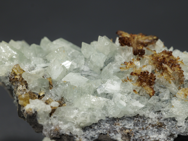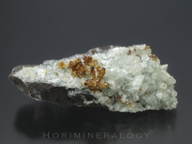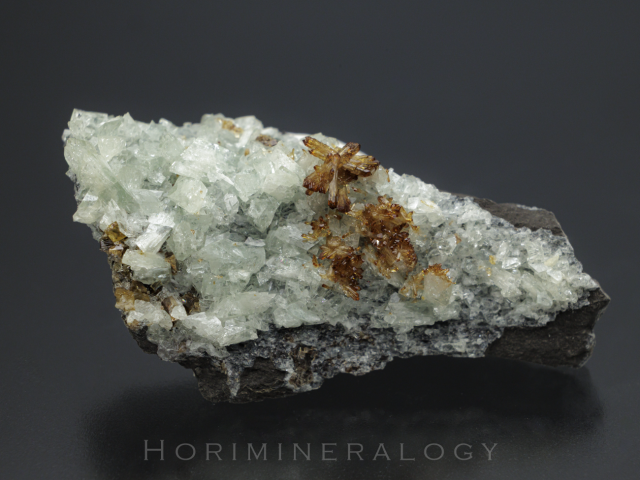 薄緑色で菱形のオージェル石、褐色菱形の菱鉄鉱を伴う