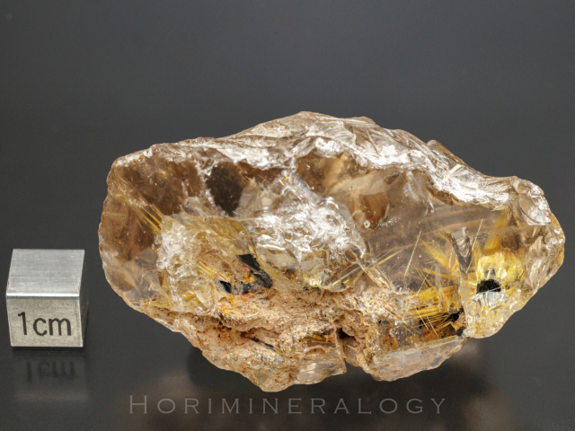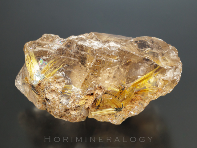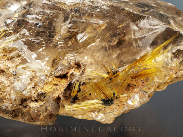 水晶の中に黒色板状の赤鉄鉱から金色針状のルチルが伸びています
