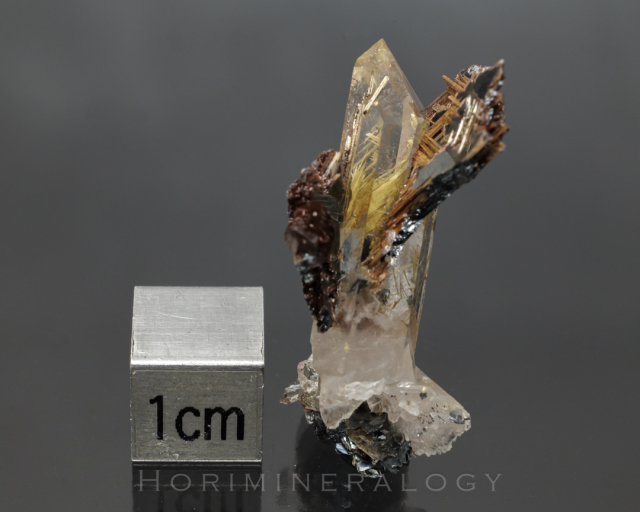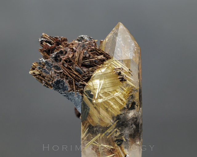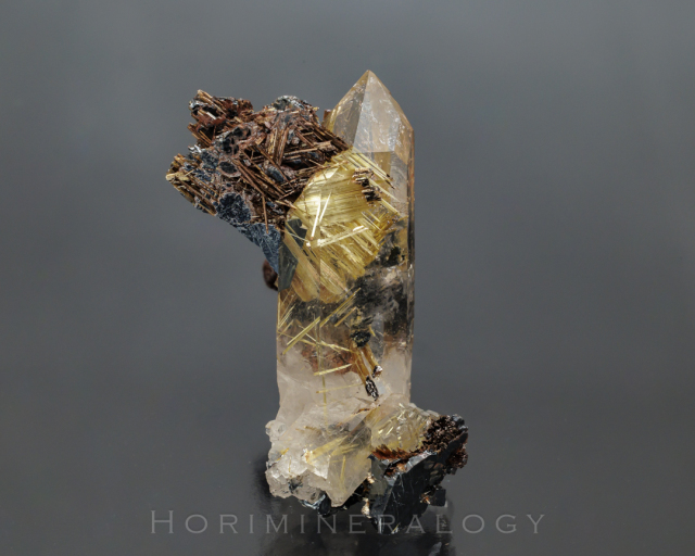 水晶の中に黒色板状の赤鉄鉱から金色針状のルチルが伸びています