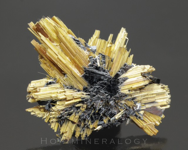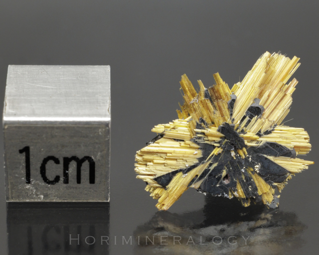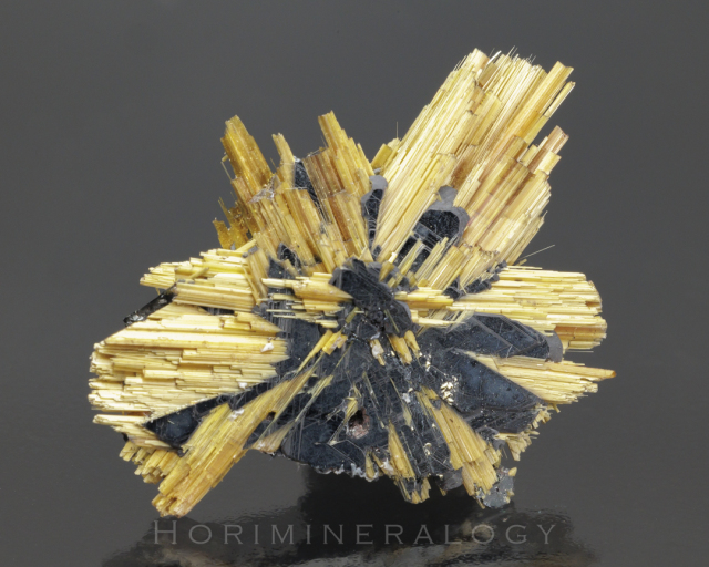黒色板状結晶の赤鉄鉱からルチルの針状結晶が伸びています