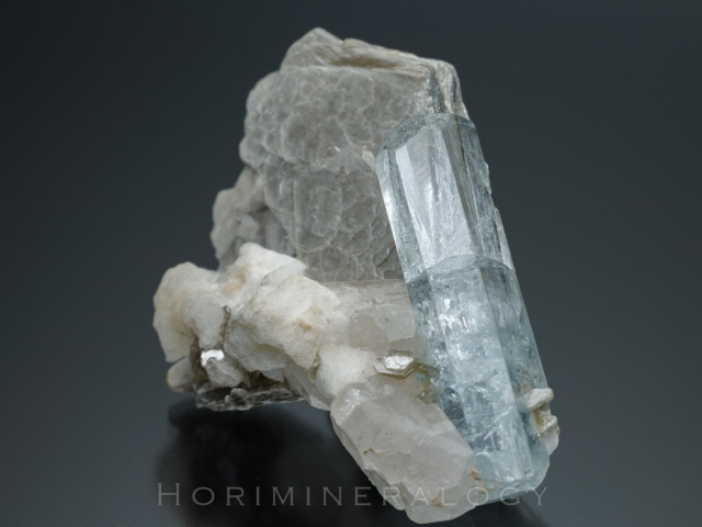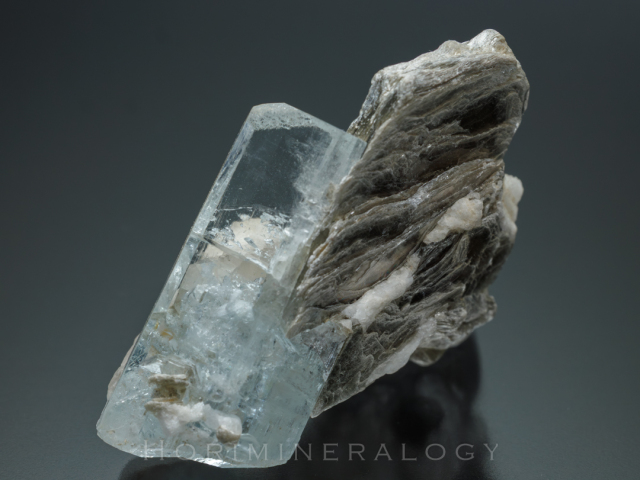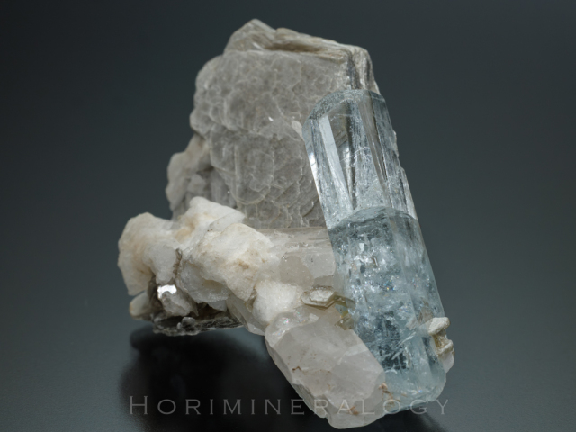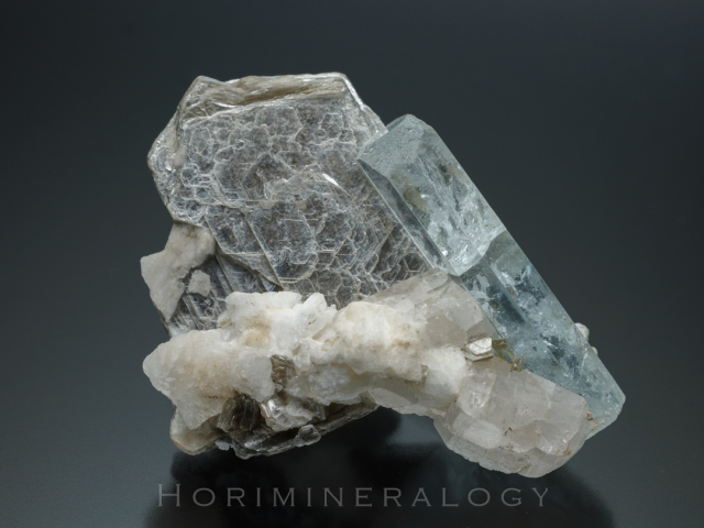 無色透明のトパーズ、白色の曹長石、白雲母を伴います