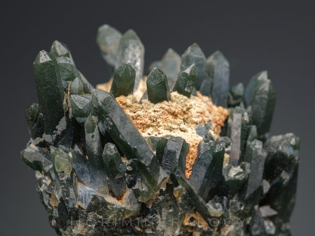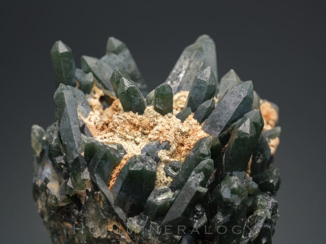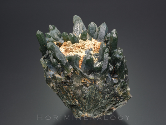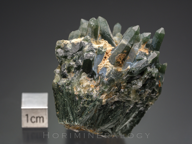 色の原因はActinoliteないしHedenbergiteの毛状結晶が内包していることによります